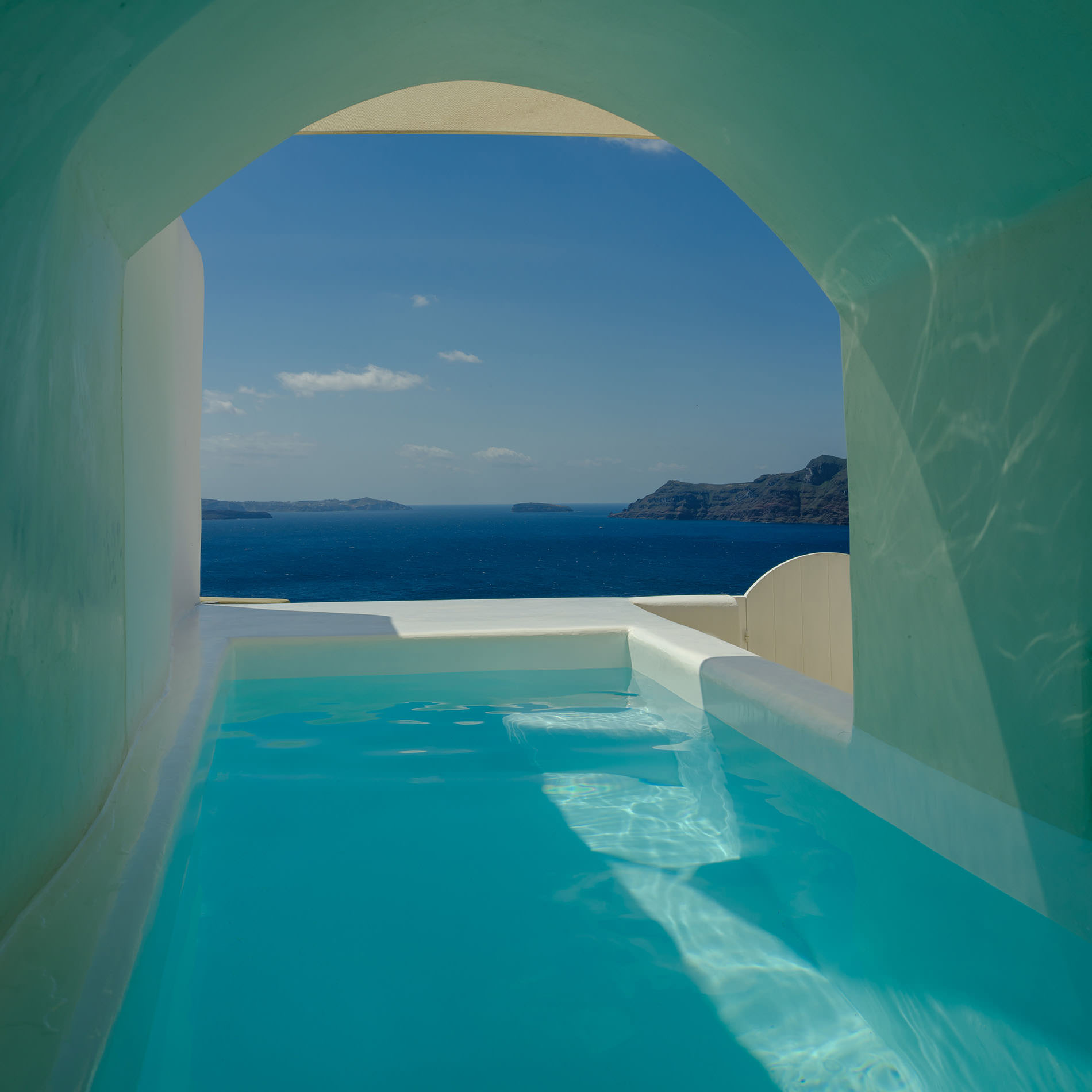 Situated just a few meters away from the iconic Blue Domes of Oia, Aphrodite Suite ensures that its guests will experience moments of absolute relaxation and tranquility surrounded by the most enticing and charming scenery. It’s the perfect choice for two as it features a dreamy spacious bedroom with a private terrace and an outdoor heated jacuzzi overlooking the world-renowned Santorini volcano and the imposing caldera.
